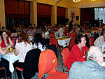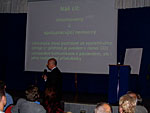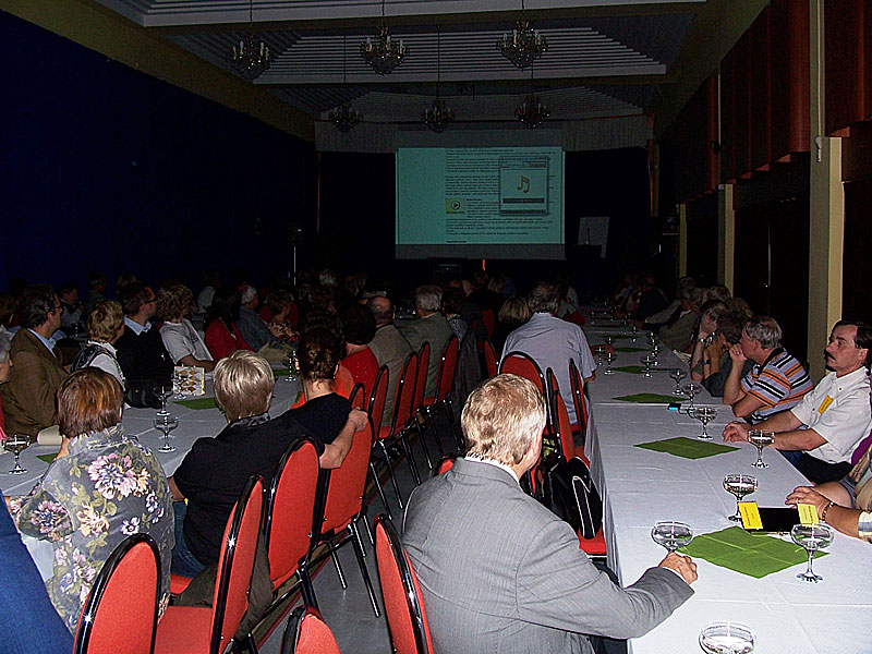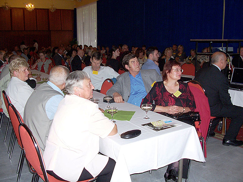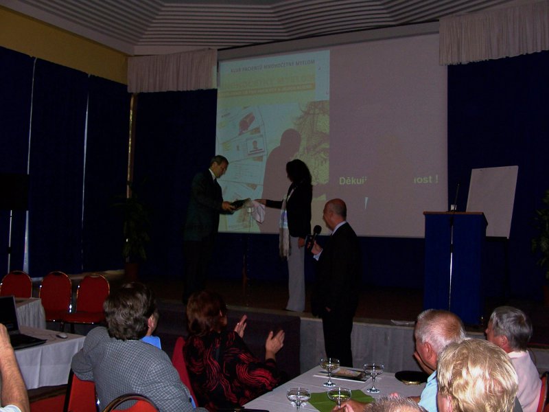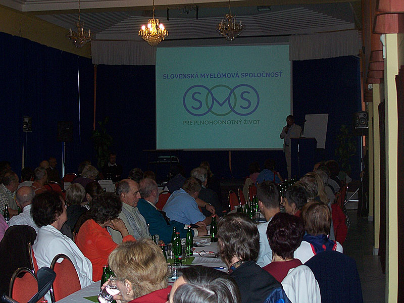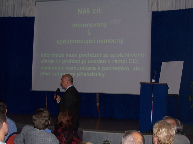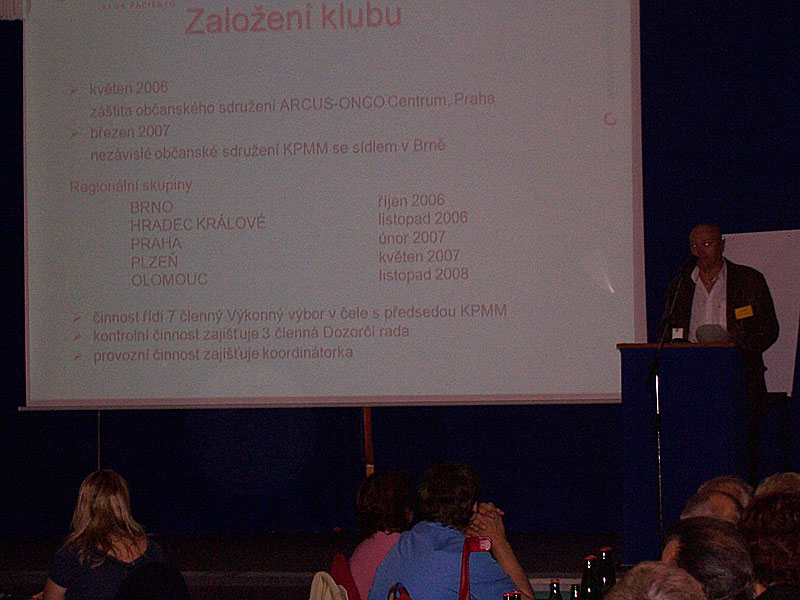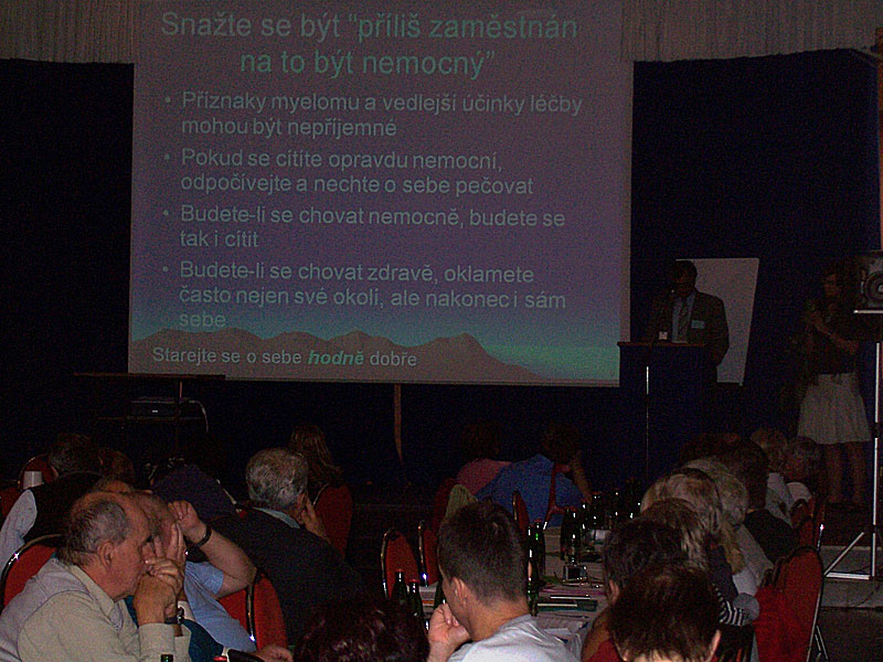 Semináře se zúčastnilo 65 pacientů a 42 rodinných příslušníků nebo blízkých. Většina účastníků přijela již v pátek a prožila předvečer vlastního odborného semináře v příjemné a neformální atmosféře. Po tradičním přípitku a slavnostním uvítání, které přednesli předseda správní rady nadačního fondu CMG prof. MUDr. Roman Hájek, CSc. a zastupující místopředseda KPMM ing. Josef Hájek se neméně slavnostního úkolu zhostil doc. MUDr. Vladimír Maisnar, Ph.D. Ve svém příspěvku pokřtil a představil nově vznikající produkt – vzdělávací CD pro pacienty s mnohočetným myelomem a jejich blízké, na kterém se nemalou měrou podílel Klub pacientů. Jedná se o velmi přehledný a názorný souhrn informací o diagnostice, léčbě a životě s touto nemocí. Odborná tématika na CD je doplněna radami a doporučeními, které by mohly pacienty s myelomem zajímat a zároveň si mohou své vědomosti ověřit v jednoduchých kvízech, otázkách a křížovkách. Věříme, že si toto CD najde své příznivce a hlavně, že bude materiálem, do kterého budou nemocní nahlížet v různém období léčby. Po praktické ukázce z CD se již všichni odebrali k připravenému občerstvení a ke zpříjemnění atmosféry a také k tanci hrála místní skupina Waves Miloše Petráška. Společenský večer byl ukončen lehce po 23. hodině, kdy se i poslední vytrvalci odebrali do svých pokojů, aby si dostatečně odpočinuli před „náročným“ sobotním programem.
