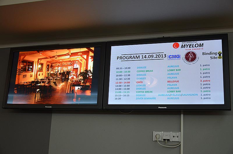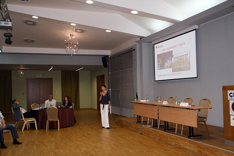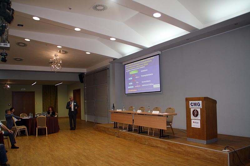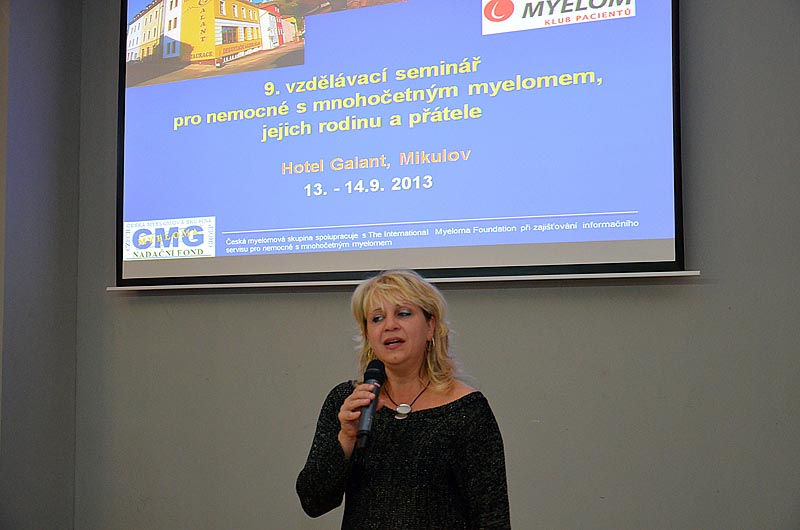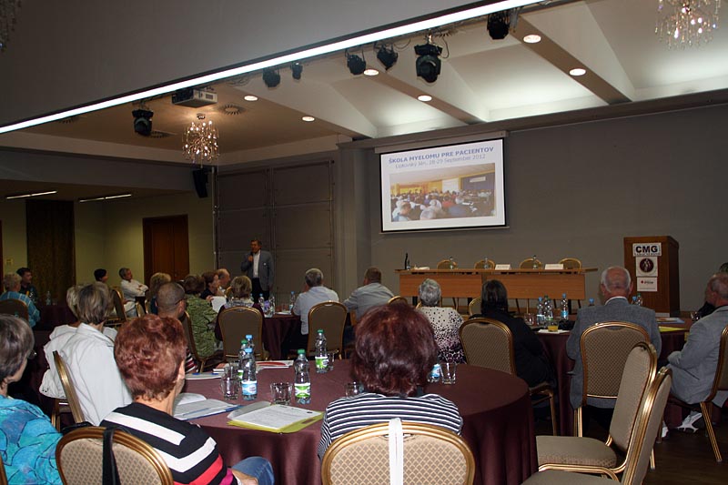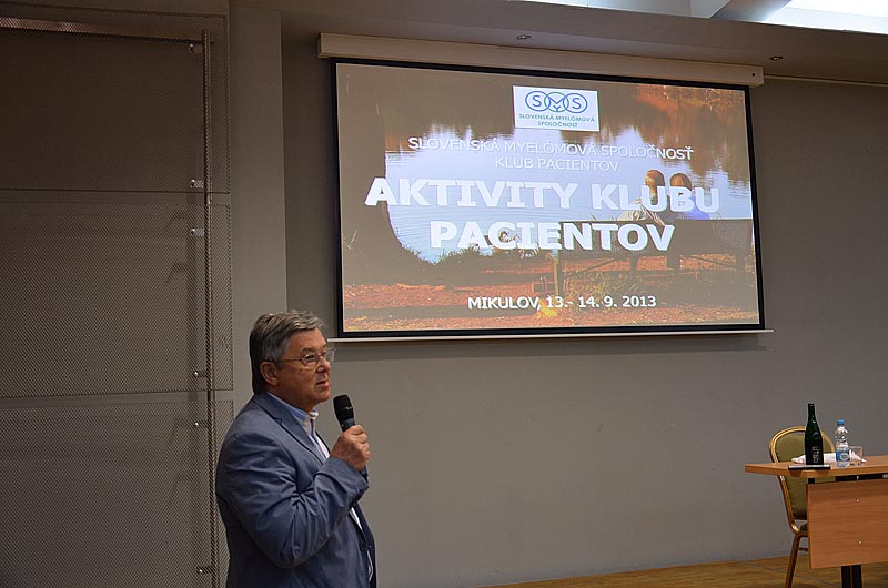 Pak už se střídali přednášející přesně podle programu. Prof. R. Hájek se zaměřil ve svém příspěvku na spolupráci v rámci provádění klinických studií s European Myeloma Network a shrnul nejdůležitější projekty a vysvětlil jejich význam pro pacienty s MM. Bohatou činnost Klubu pacientů mnohočetný myelom tentokrát představila koordinátorka Klubu Mgr. Alice Onderková a svůj příspěvek připravila jako odpovědi na otázky, které vyjadřují oblíbenost jednotlivých aktivit. Jejím komentářům souhlasně přikyvovali všichni přítomní. Nový projekt Klubu pacientov Slovenskej myelomovej spoločnosti „Návrat ku zdraviu“ ve svém sdělení přiblížil doc. M. Hrianka.