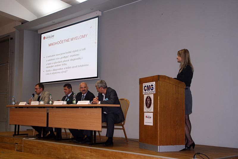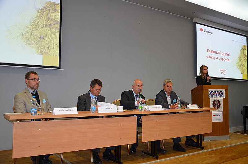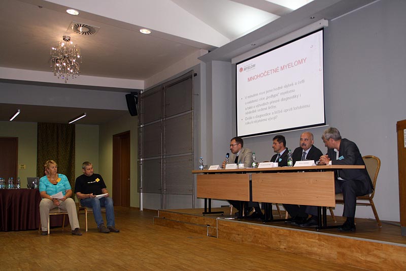 Po přestávce následovala panelová diskuze, na kterou se těšili nejen posluchači, ale i všichni přítomní experti na léčbu myelomu – prof. R. Hájek, doc. V. Maisnar, MUDr. J. Straub a MUDr. P. Pavlíček. Otázky do diskuze vzešly od samotných nemocných a k některým se vyjadřovali všichni lékaři a tak jsme měli možnost vyslechnout si jejich osobní názor, který se mohl lišit od těch ostatních. Toto přináší určitou možnost volby a ujištění, že problém má i více řešení, zvláště když některá metoda selhává nebo nevyhovuje.