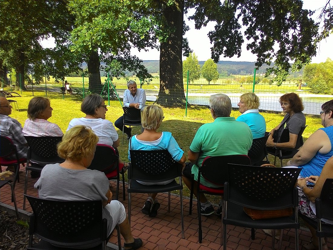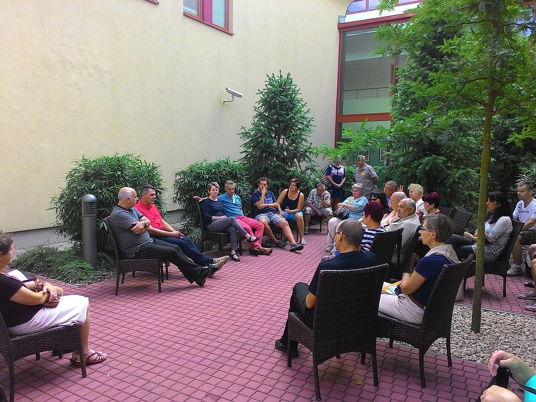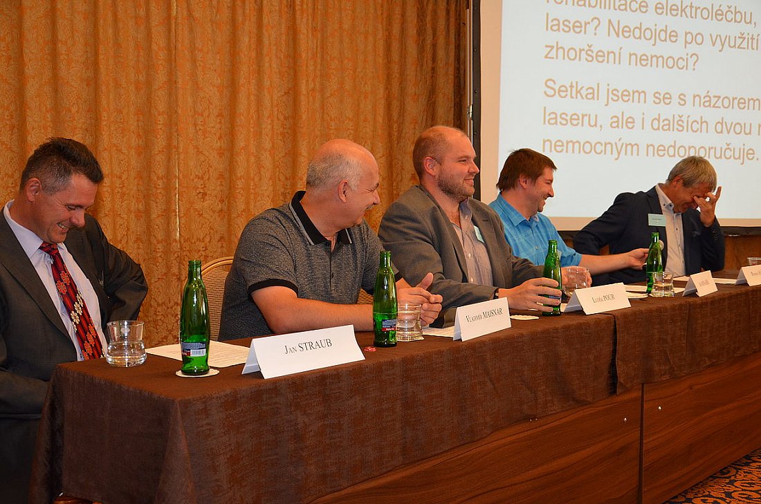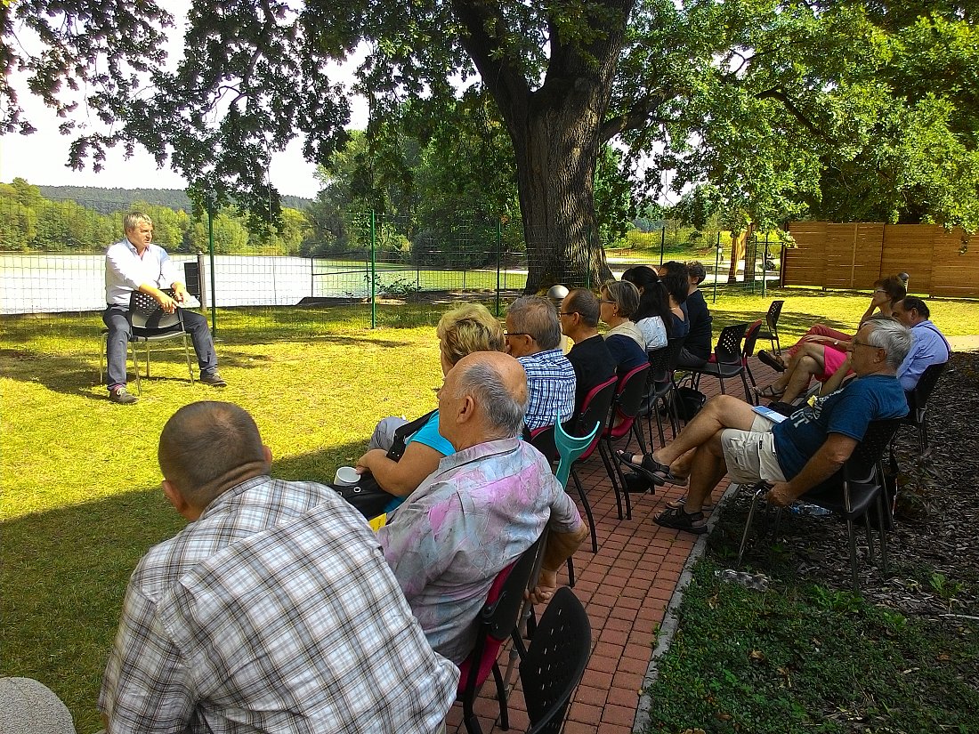 Po obědě byly připraveny tři diskuzní skupiny se třemi rozdílnými tématy, ze kterých si mohli účastnící semináře vybrat podle svého zájmu. Už si začínáme zvykat, že počasí nám přeje a tak i letos jsme mohli pro dvě skupiny připravit posezení venku. Místo pod korunou košatého dubu si oblíbil prof. Hájek a se svojí skupinou diskutoval o limitacích nových léků. Prof. Maisnar a Dr. Straub se usadili se svojí skupinou do stínu v příjemném zákoutí hotelu a tématem diskuzí byly nežádoucí účinky léčby. Doc. Pour a doc. Minařík zůstali se svojí skupinou v hlavním sále a čelili nelehkým a zdá se nikdy nekončícím otázkám, jak a do jaké míry lze ovlivnit neuropatie. Na všech místech se vzrušeně diskutovalo a bylo tak velmi obtížné rozhovory ukončit a pozvat všechny na krátké občerstvení. Po odpolední kávě se účastníci ve skupinách vyměnili.