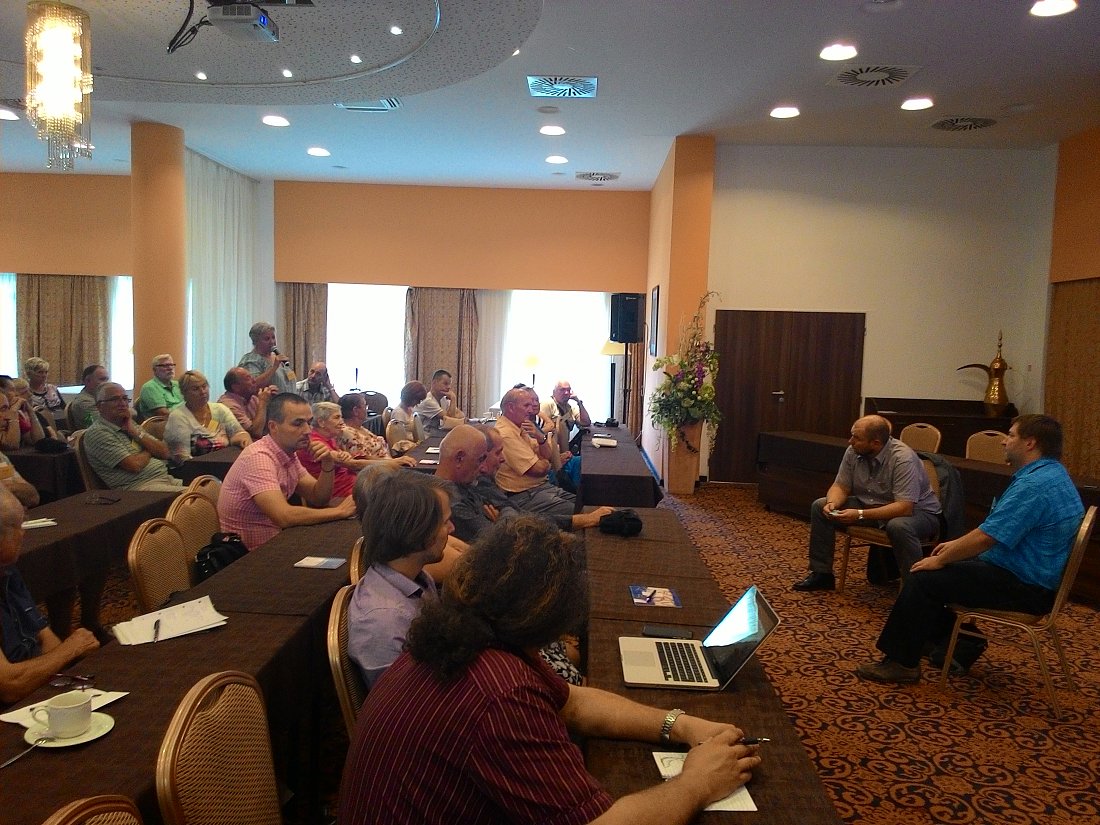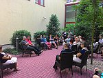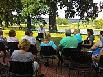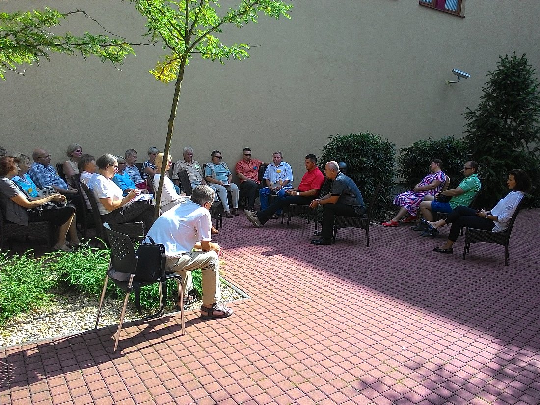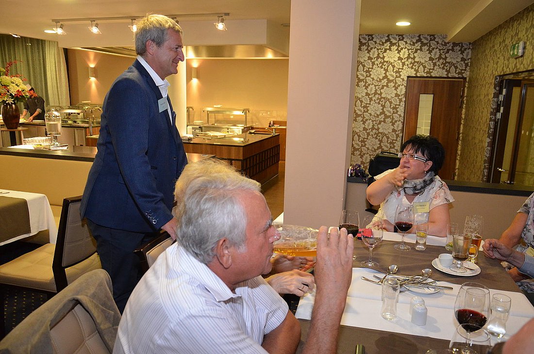 Po obědě byly připraveny tři diskuzní skupiny se třemi rozdílnými tématy, ze kterých si mohli účastnící semináře vybrat podle svého zájmu. Už si začínáme zvykat, že počasí nám přeje a tak i letos jsme mohli pro dvě skupiny připravit posezení venku. Místo pod korunou košatého dubu si oblíbil prof. Hájek a se svojí skupinou diskutoval o limitacích nových léků. Prof. Maisnar a Dr. Straub se usadili se svojí skupinou do stínu v příjemném zákoutí hotelu a tématem diskuzí byly nežádoucí účinky léčby. Doc. Pour a doc. Minařík zůstali se svojí skupinou v hlavním sále a čelili nelehkým a zdá se nikdy nekončícím otázkám, jak a do jaké míry lze ovlivnit neuropatie. Na všech místech se vzrušeně diskutovalo a bylo tak velmi obtížné rozhovory ukončit a pozvat všechny na krátké občerstvení. Po odpolední kávě se účastníci ve skupinách vyměnili.