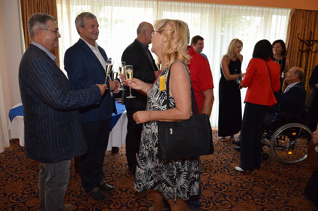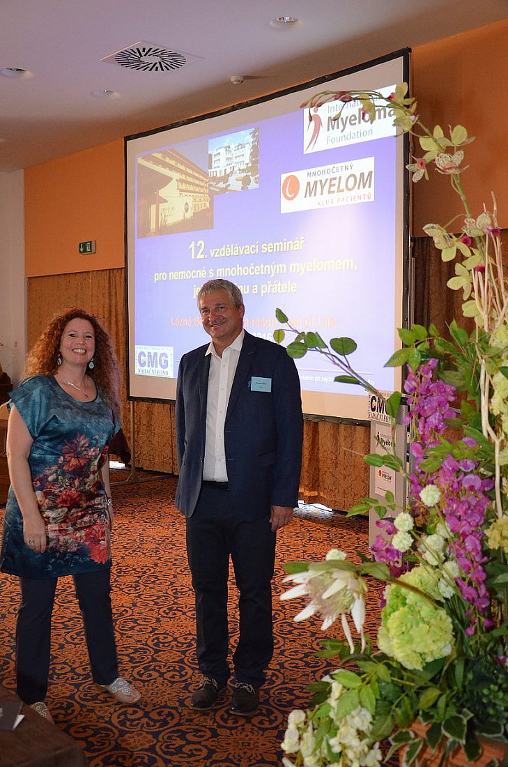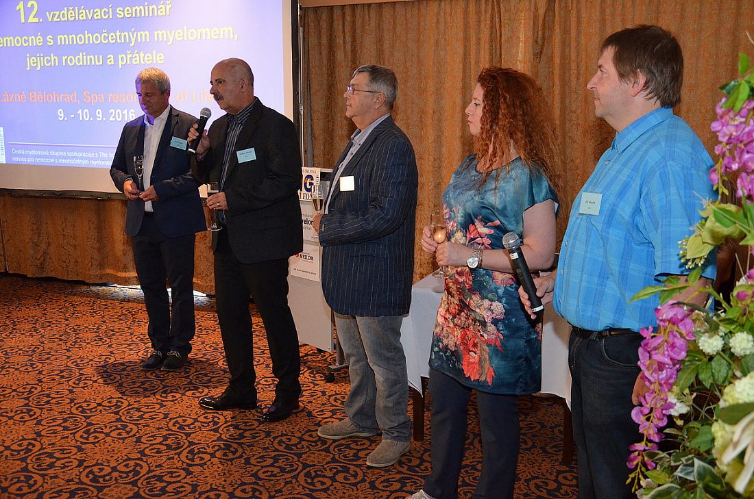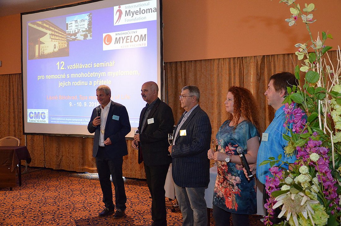 Páteční večer byl zahájen uvítacím proslovem zástupců organizátorů a hostů. Za nadační fond CMG přítomné přivítal předseda správní rady prof. MUDr. Roman Hájek, CSc., za Českou myelomovou skupinu, spolek promluvil 1. tajemník prof. MUDr. Vladimír Maisnar, Ph.D., MBA, za Klub pacientů MM hovořil jeho předseda, pan Petr Hylena a za IMF paní Nadia Elkebir a její slova překládal do češtiny v průběhu celého semináře doc. MUDr. Jiří Minařík, Ph.D. Ve svém proslovu vyjádřila radost z opětovného setkání a návštěvy České republiky a také poděkovala za vše co CMG a KPMM pro pacienty s myelomem dělají. Při té příležitosti předala prof. Hájkovi a panu Hylenovi plaketu Global Myeloma Action Network (GMAN, advokátní iniciativa IMF) s datem založení obou organizací.
