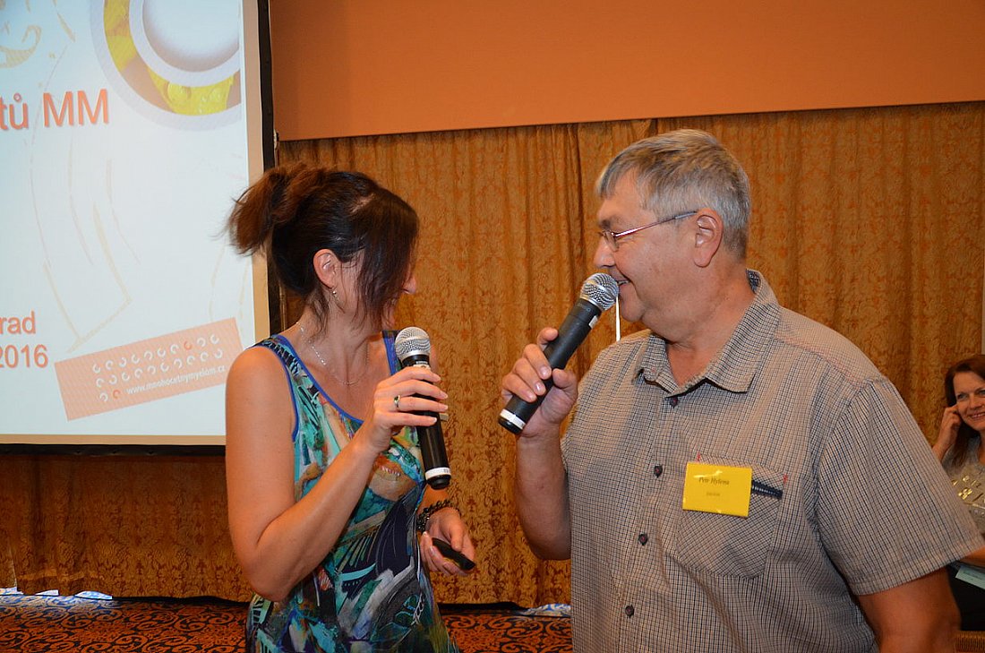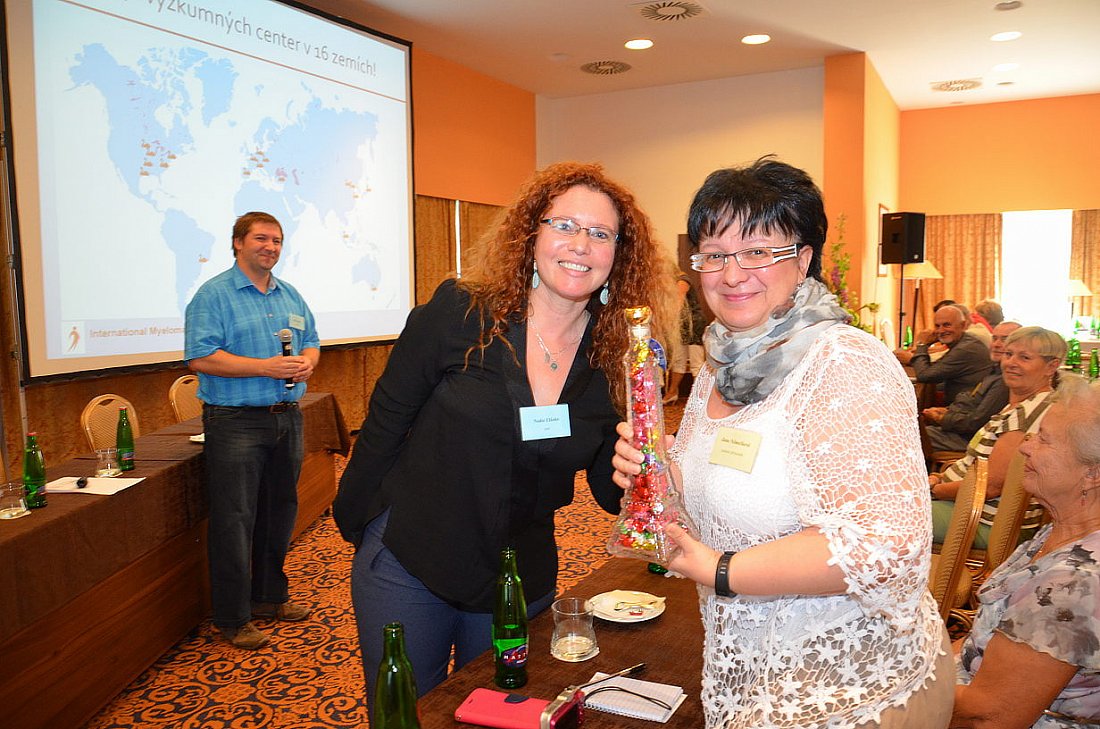 Sobotní program byl zahájen po vydatné snídani v půl deváté. Jak se již osvědčilo v předešlých ročnících semináře, i letos organizátoři připravili seminář více interaktivně, to znamená co nejméně odborných sdělení a více prostoru pro dotazy a diskuze. Úvodní slovo jako vždy patřilo prof. Hájkovi, který přivítal všechny přítomné, zvláště ty, kteří přijeli až v sobotu ráno a stručně představil organizační tým a obsahovou skladbu semináře. Na závěr představil a „pokřtil“ 3 nové brožury pro pacienty. S nástupem nových léků v rámci klinických studií a specifických léčebných programů byly pro potřeby pacientů sepsány základní informace o třech nových přípravcích: Imnovid (pomalidomid), Ninlaro (ixazomib) a Empliciti (elotuzumab). Doufáme, že tyto léky bude užívat co nejvíce pacientů. Zbytek dopoledne patřil prezentacím aktivit organizátorů a jejich partnerů. O roli České myelomové skupiny na poli mnohočetného myelomu v České republice i v zahraničí pohovořil profesor Maisnar. Ve svém příspěvku shrnul informace o myelomu a pokrocích v léčbě, zmapoval historii organizace a zastavil se u nejdůležitějších projektů, jako je Registr monoklonálních gamapatií, pravděpodobně největšího registru na světě a projektu CRAB, který úspěšně seznamuje praktické lékaře a jiné odbornosti s příznaky myelomu, tak aby tato diagnóza byla včas odhalena a zahájena účinná léčba. V následujícím sdělení bohatou činnost Klubu pacientů mnohočetný myelom shrnuli předseda pan Petr Hylena společně s Mgr. Alicí Onderkovou, koordinátorkou Klubu. O aktivitách Klubu pacientů na Slovensku pohovořil doc. Miroslav Hrianka. Svůj příspěvek obohatil videozáznamem z minimaratonu, kde byla „myelomová obce“ hojně zastoupena. Posledním příspěvkem před dopolední přestávkou byla prezentace Nadii Elkebir, která shrnula poslání IMF v celosvětovém měřítku a na konci příspěvku vyzkoušela pozornost přítomných. Naštěstí odpověď, jaké jsou čtyři hlavní pilíře aktivit IMF (vzdělání, podpora, výzkum a advokacie) zazněla a odměna byla doslova sladká.
