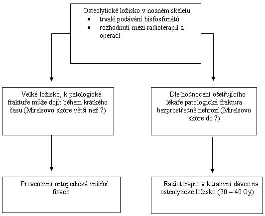 Postup v případě velkého osteolytického ložiska v nosném skeletu, které může v krátké době způsobit patologickou frakturu.